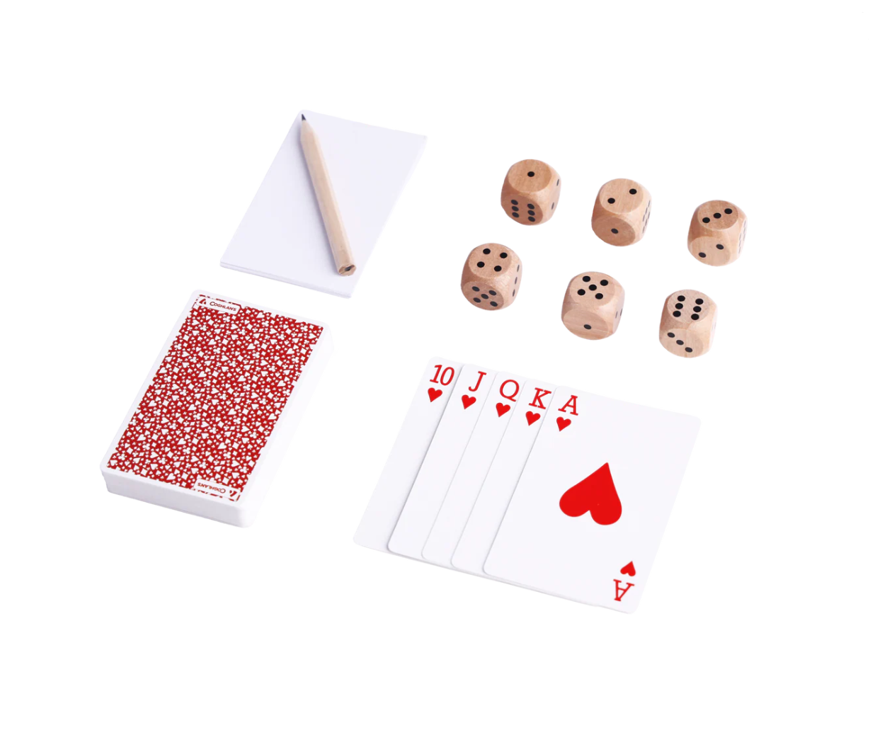- Includes a deck of cards, paper, pencil