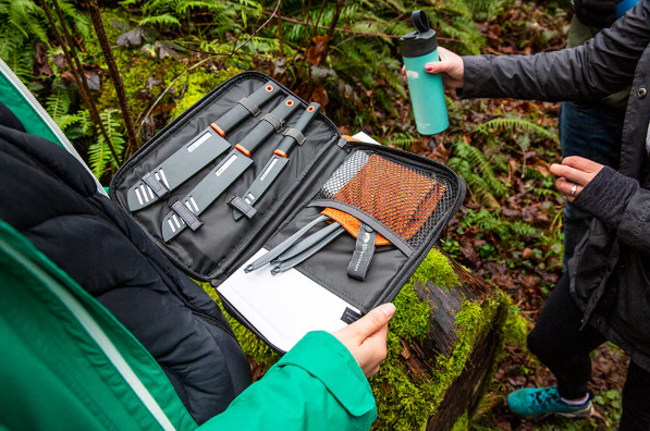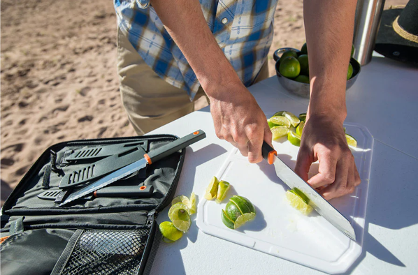 - Includes: 4" Paring Knife with Sheath, 6" Santoku Chef's Knife with Sheath, 6" Serrated Bread Knife with Sheath, Folding Cutting Board, Soap Bottle, Dish Cloth, Ballistic Nylon Case