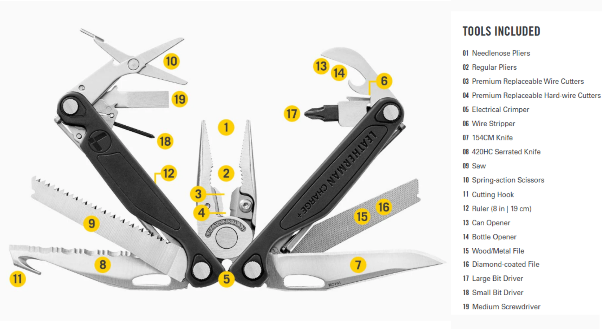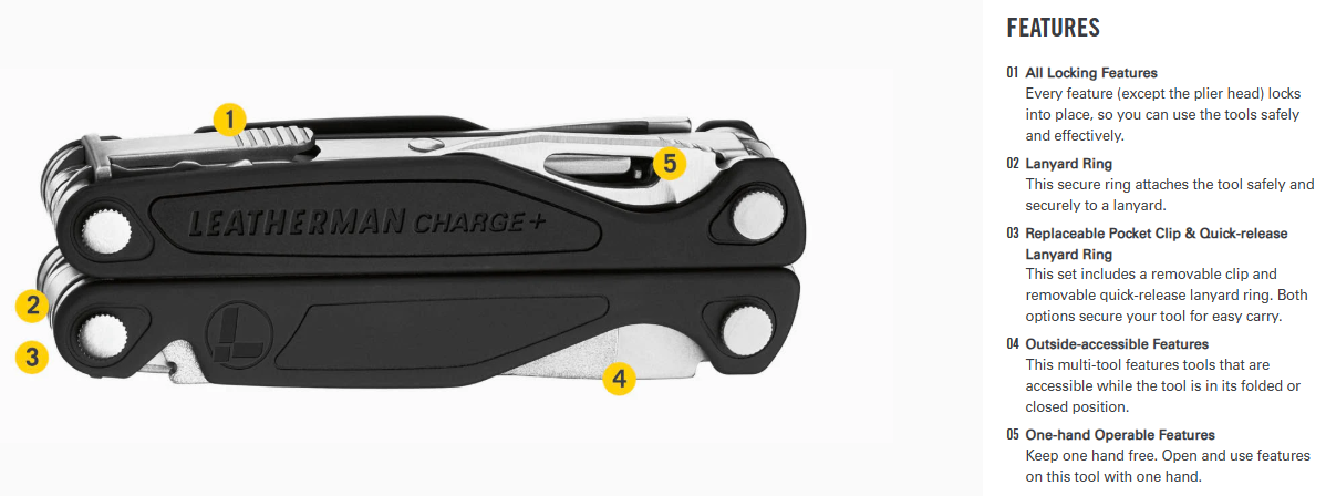 Every tool on the ultra-useful Charge Plus makes it adventure worthy. The scissors slice through anything, the wire cutters are made in a durable material and are replaceable, and the knife blade is made in a strong, corrosion-resistant 154CM steel. Need an extra hand? No problem. Every tool can be opened and locked with just one hand. Includes removable pocket clip.