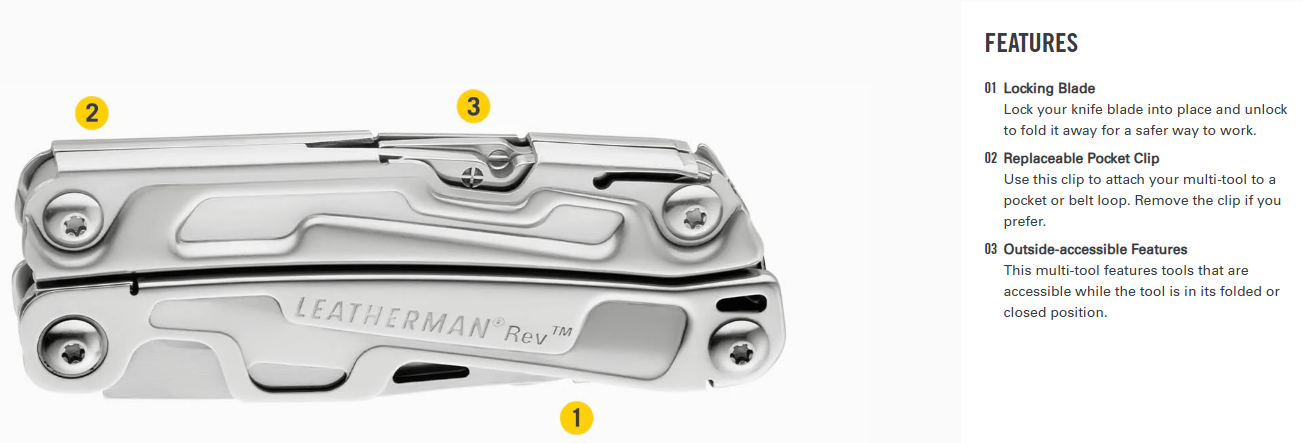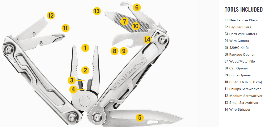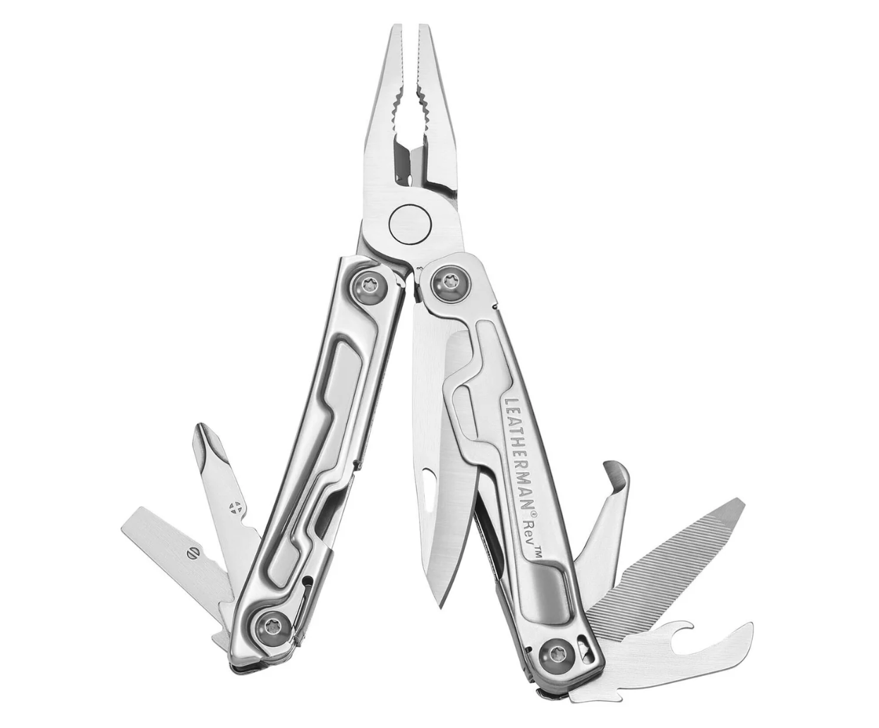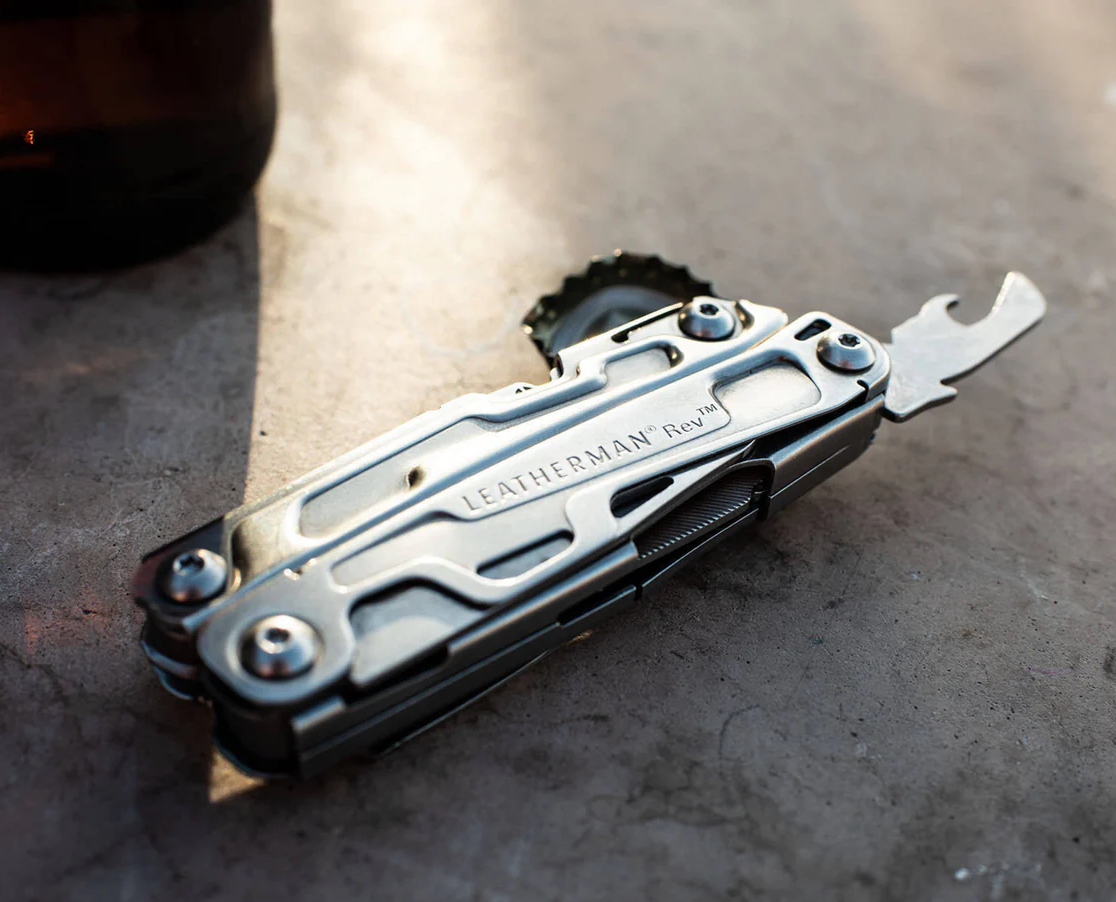The Leatherman Rev allows you to grab a toolbox full of functionality and keep it at your fingertips, no matter where you might be: under the hood, at the campground, finishing honey-do projects around the house or cracking open a cold one at the tailgate. The Rev features 14 soon-to-be-indispensable tools, an outside accessible 420HC blade and a replaceable pocket clip for easy carry, and as always is backed by the Leatherman 25-year warranty.
