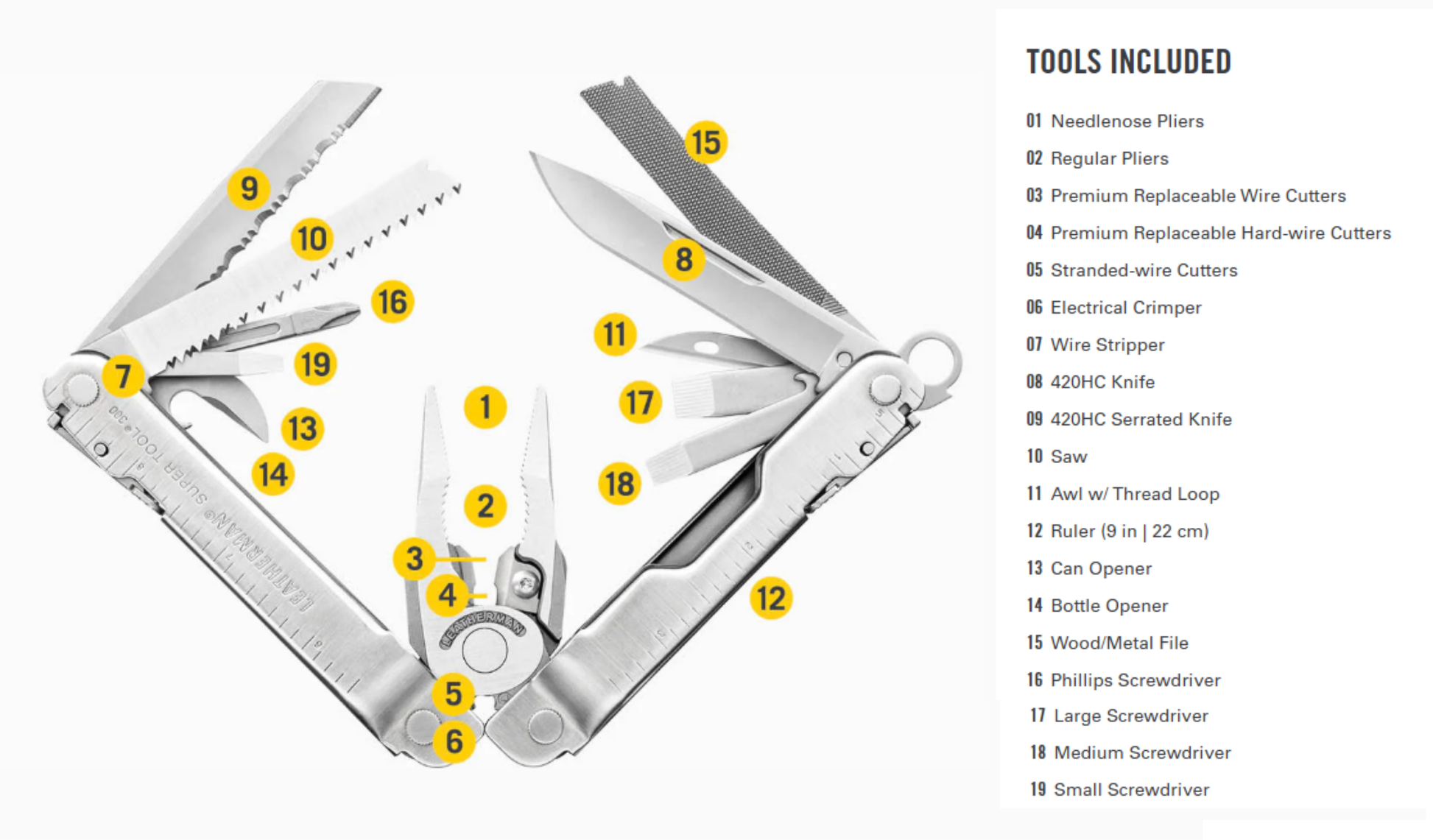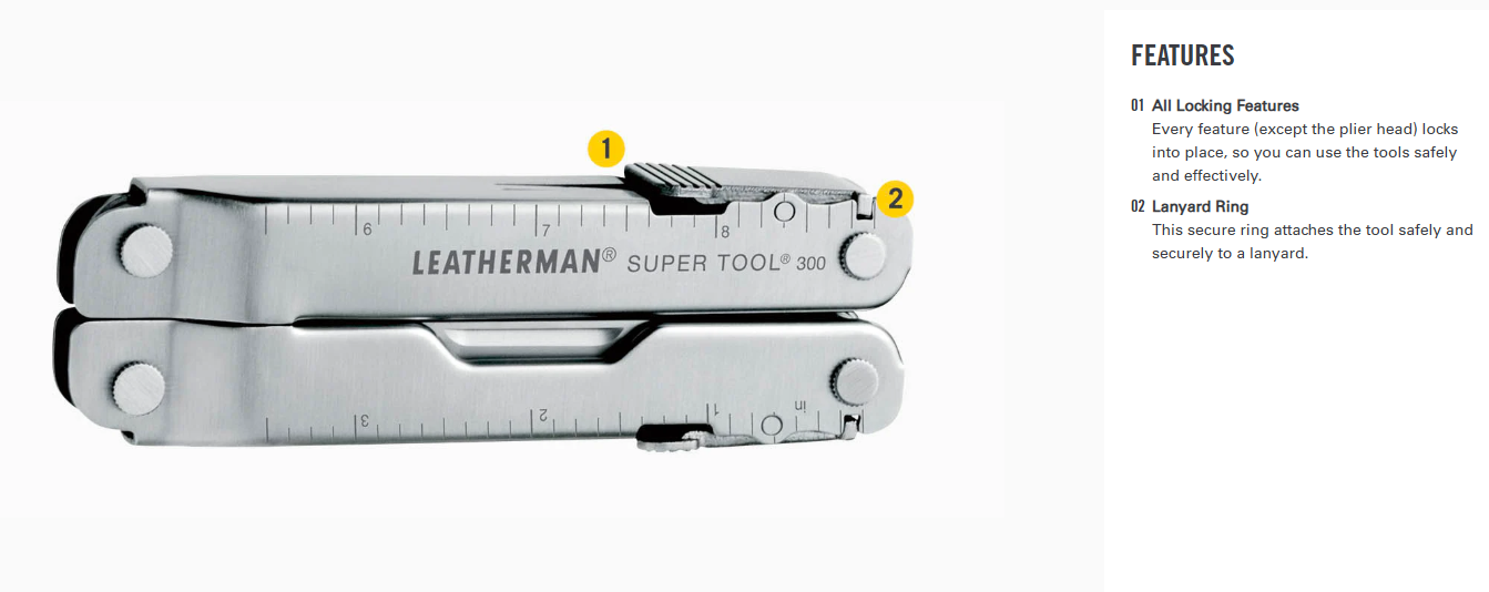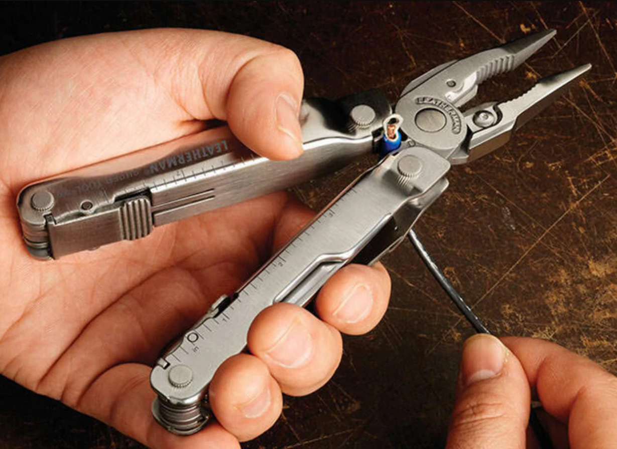 The award-winning, Leatherman Super Tool 300 is the multi-tool for the working man. Larger pliers are the strongest we've ever produced, and the sloped-top handle design means you can maneuver them further into tight spaces. When you're working with gloves on, the large side cut outs make it easy to still grab components and rolled handles make for a comfortable grip. Stranded, hard and regular wire cutters all come standard on Super Tool 300, and because they're removable you can repair or re-sharpen on the spot. 19 tools already for your toughest jobs. Super Tool 300 is back from vacation and ready to get to work.