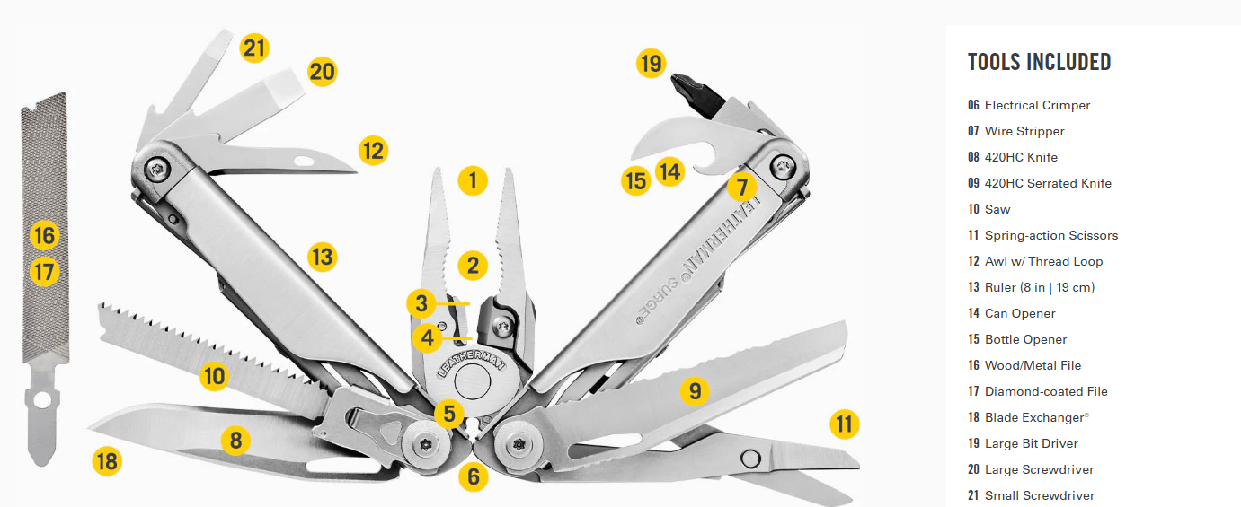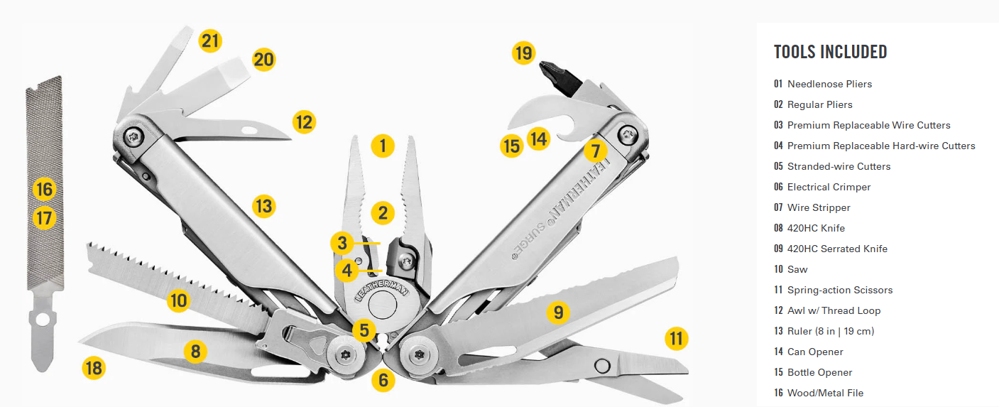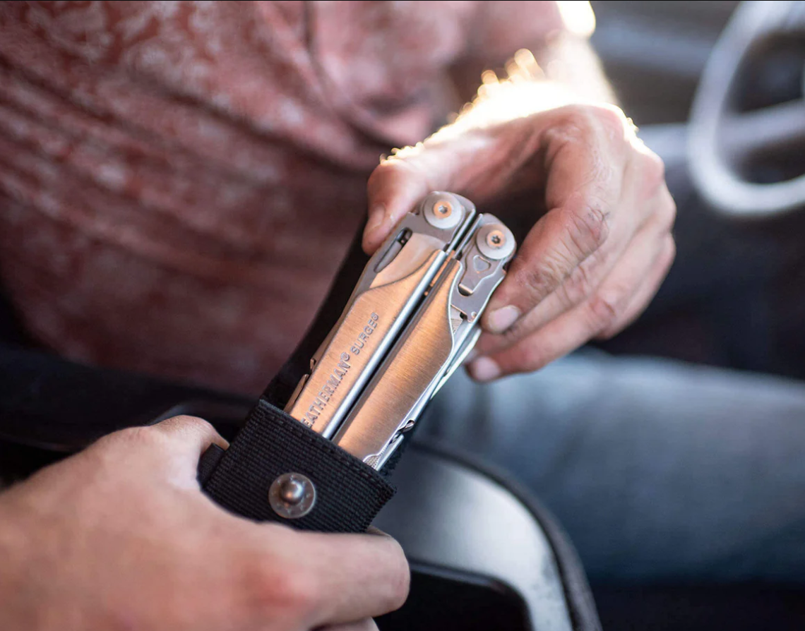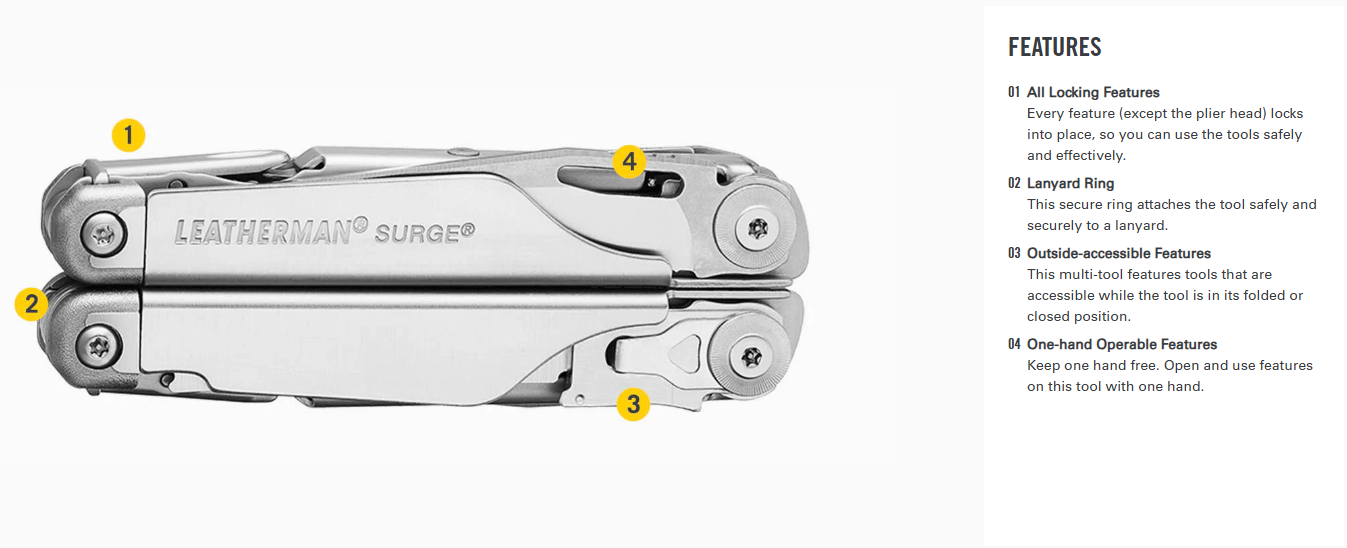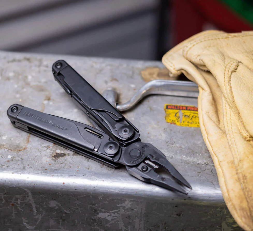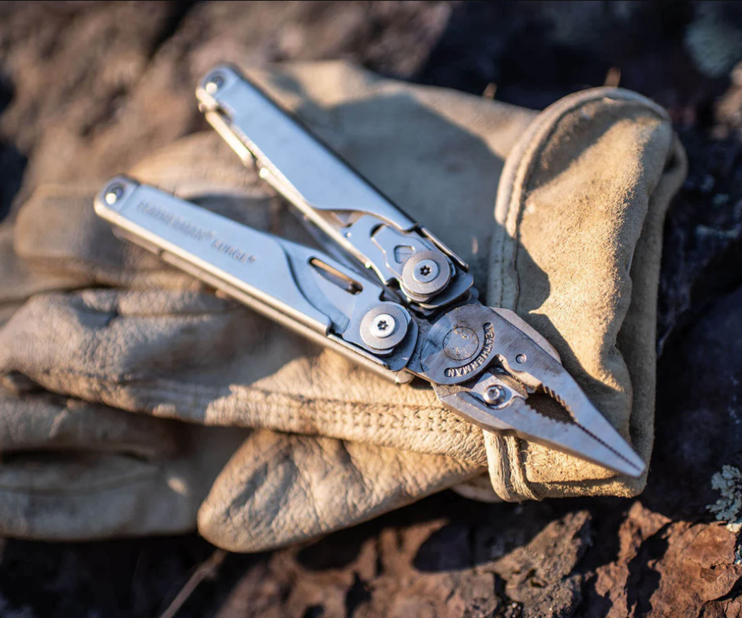 The Leatherman Surge is one of our two largest multi-tools; a real powerhouse, built with our largest pliers, longest multi-tool blades and easy-to-use locks. A unique blade exchanger, replaceable premium wire cutters and four outside-opening blades give you quick access to the tools you use most. The Surge was built for tough jobs and the hands that do them.