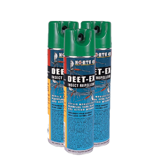 North 49's DEET-EX insect repellent contains 28.5% DEET and is useful in repelling Mosquitoes, Black Flies, Ticks, Fleas and Biting Midges for hours on end.