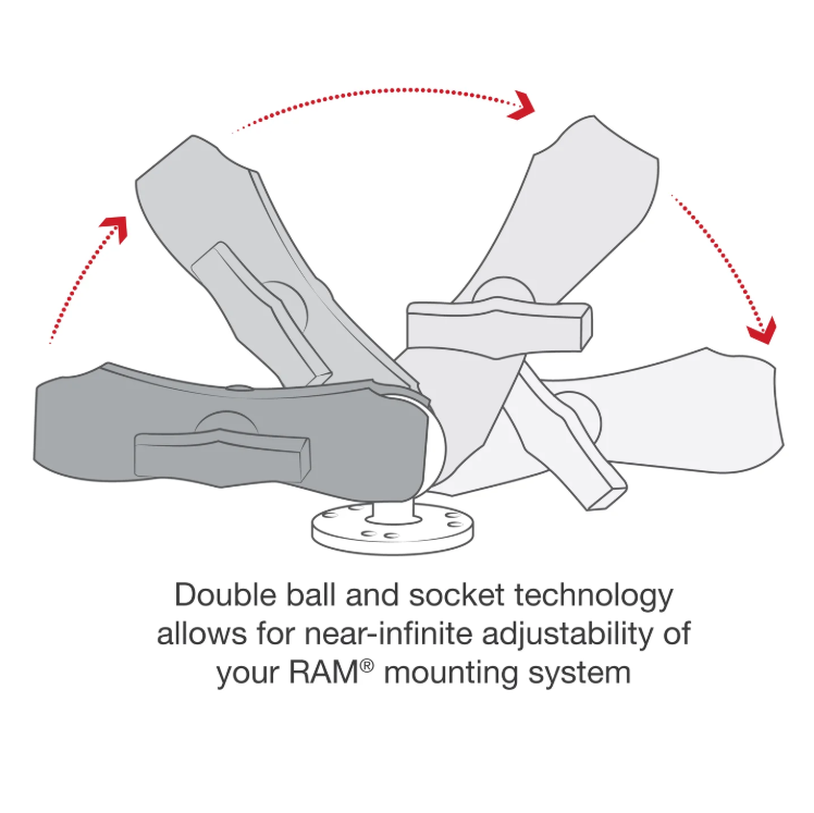 The RAM-101U consists of a medium length C size 1.5" double socket arm and two 2.5" diameter round ball bases that contain the universal AMPS hole pattern. The ball and socket system provides shock and vibration damping, and allows for near-infinite adjustability to achieve an ideal viewing and operating angle of your device.