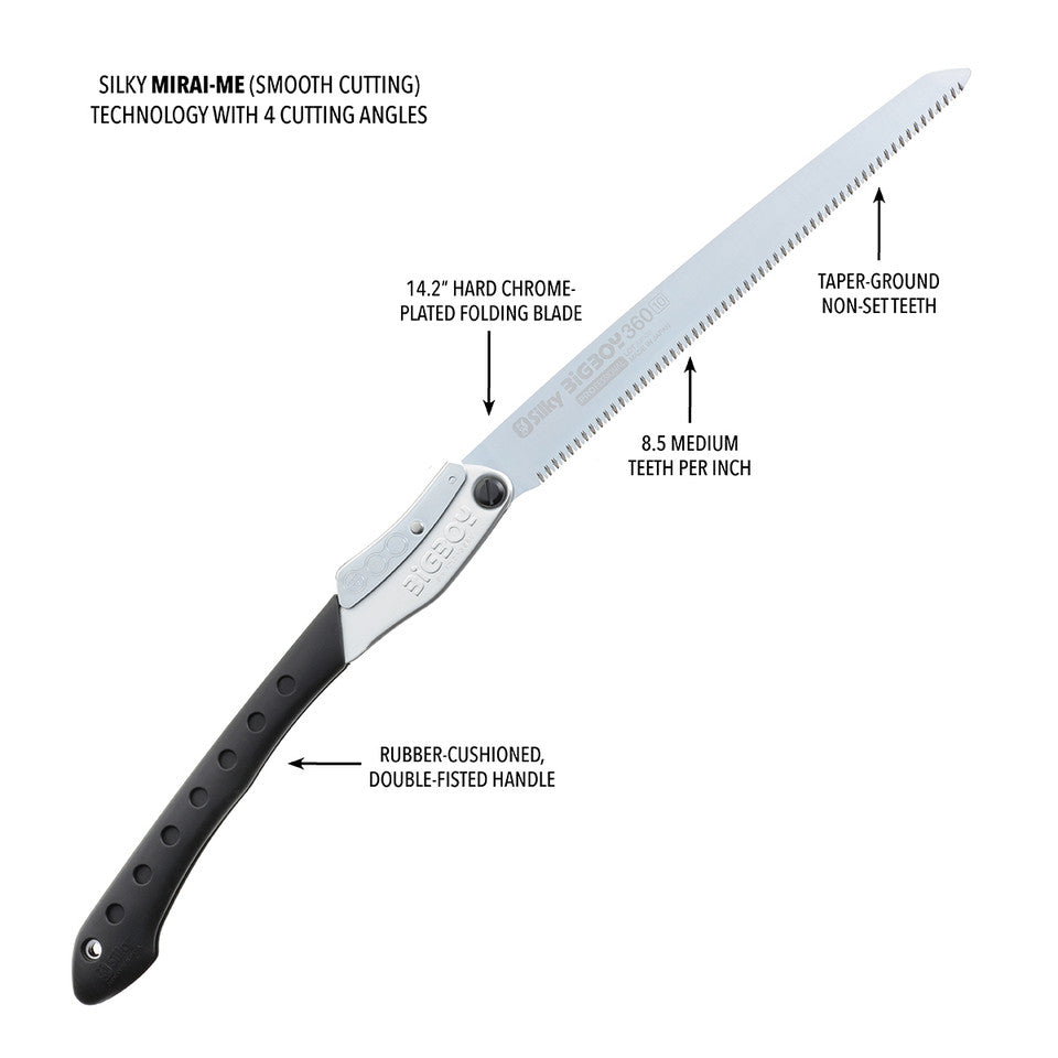 Silky's BIGBOY 360 Folding Saw is the largest Silky folding saw model and every outdoor worker's dream. There are folding saws and then there is the BIGBOY. With a blade length of over 14 inches, the BIGBOY offers a larger cutting capacity, extended reach, and longer stroke for fast cutting. This saw can handle large limbs, small trunks and even many construction projects with no problem. Lightweight, with a thicker and stronger aluminum handle and longer blade, the BIGBOY is perfect for cutting larger jobs down to size. This saw weighs just 0.89 lbs. (405 g). If you need to cut bigger material than what an average length folding saw can handle, the BIGBOY is a āmust haveā in your cutting arsenal. This medium tooth version has a straight blade.