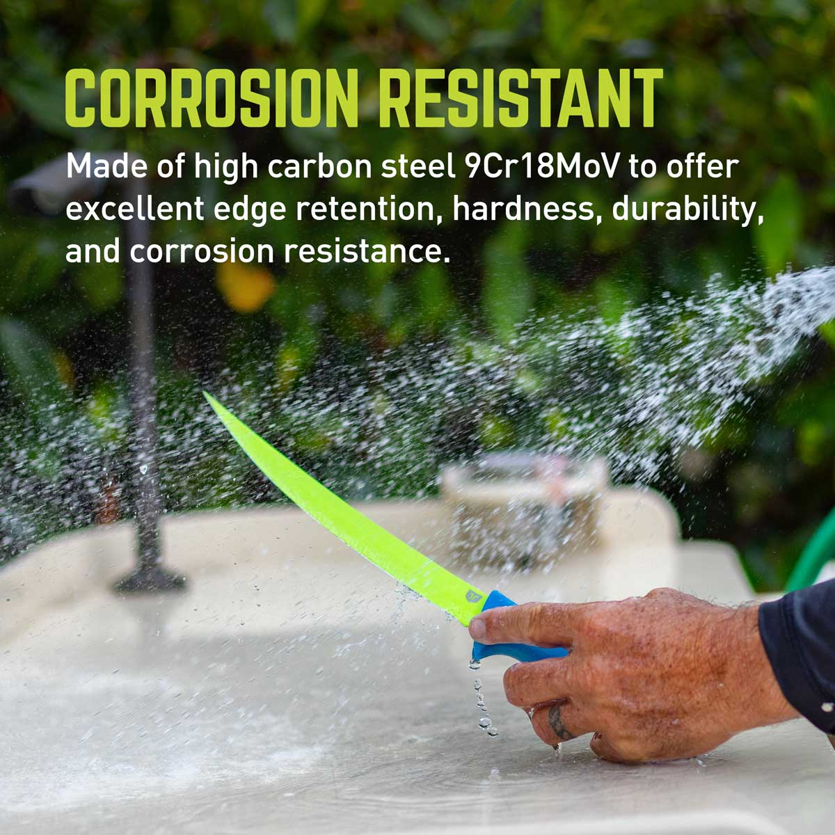 Ideal for both freshwater and saltwater use, the SYK knives boast a Hi-Viz blade that's as visually appealing as it is safe. The 9Cr18MoV high carbon steel construction and hollow ground blade ensures excellent edge retention, hardness, and corrosion resistance, while the Cerakote finish enhances wear resistance and overall durability.